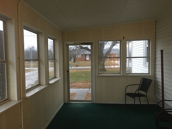 This house is a lot larger than you'd expect ! It has 3 bedrooms, 1 large bathroom with combination tub & shower . The living room is spacious with sliding windows . There is a nice sun porch with windows that open and indoor/outdoor carpeting. There are hardwood floors on main level in each room plus updated energy efficient windows. There is an eat-in kitchen with a view of the backyard. The yard has several large trees which shade the house and front yard. You'll have a great area for a garden plot , playground and trampoline space - it's less than an acre. There is also a detached garage with walk-through door and electric overhead door. This house has a full basement as well. The laundry area is located here . It has some shelving and offers a ton of storage space. You'll really appreciate this area when the storms blow through town and you have a safe place to go to ! It is located just as the edge of town and is in a quiet area. The bus goes right past your house . You'll definitely want to put this home top on your list of ones to view in person .