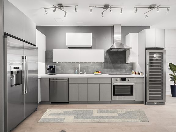 The state-of-the-art kitchen is a chef's dream, outfitted with premium Bosch appliances, including a sleek oven and in-unit Bosch washer and dryer for everyday ease. A Zephyr wine cooler adds a touch of sophistication, perfect for entertaining. The spa-inspired bathrooms are equally impressive, boasting heated floors and heated towel racks for unmatched comfort.
