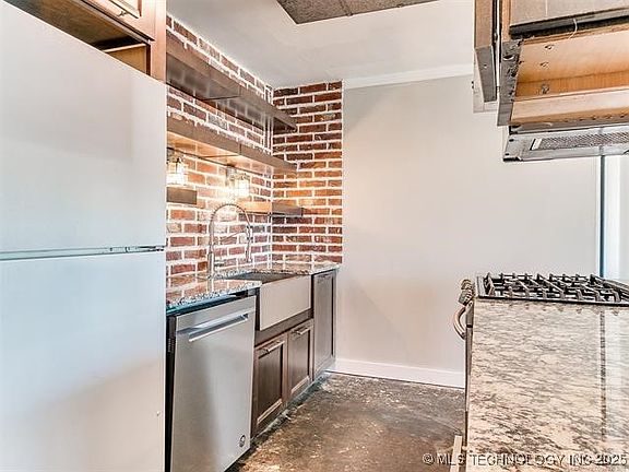 Choose Central Park where you will absolutely love stunning Downtown Tulsa views every day from this unique & custom, industrial-vibe 1-Bedroom / 1-Bath 15th floor condominium! Step inside and enjoy the wonderful openness and natural light for easy entertaining and flow! The stage has been set for you, to include: custom cabinetry & open kitchen shelving, stainless dishwasher, stainless stove w/modern overhead exhaust & lighting, natural brick backsplash & elsewhere throughout the modern concept, deep stainless barn sink, and single handle pull-down kitchen faucet, and plenty of granite counter surface for easy