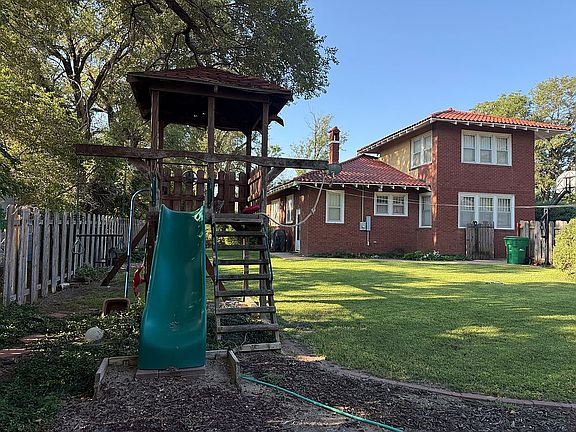 Brick homeUpdated bathTimeless woodworkRibbon mahogany wood detailsCurtained windowsExpansive covered front porchBuilt-in playhouse