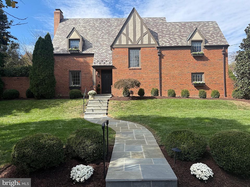 Presenting this renovated Tudor Revival nestled in the heart of Spring Valley. This home blends timeless architecture with effortless livability. Sited on a lush corner lot and lifted from the street, the red brick exterior with its storybook gables beckons you into light-filled, modern interiors. The main level includes an entry foyer, spacious living room with fireplace, formal dining room, and a chef-grade kitchen with an AGA gas range and custom cabinetry that opens to a cheerful breakfast nook framed by a bay window. A powder room, laundry, and direct access to a second patio - perfect for alfresco dining - complete this area. A comfortable den/office opens out to an enchanting walled garden and flagstone patio – with mature plantings, exquisite landscaping, and offering unparalleled tranquility and privacy. Upstairs, the serene primary suite offers abundant closet space and an ensuite bath with marble tiling and an oversized shower. Two additional bright bedrooms and a chic marble hall bath complete this level. The lower level offers a flexible family room or guest suite with a fireplace, full bath, and oversized windows. With an attached garage, driveway parking, recently updated systems, and a coveted location near shops and restaurants, this home is both refined and move-in ready.