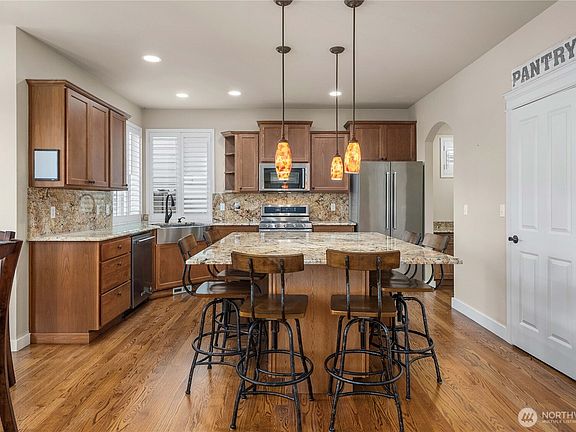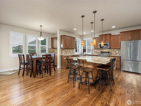 Beautiful 3,360 sq ft home overlooking Hawks Prairie Golf Course! This spacious 4-bedroom, 2.5-bath home features an inviting open-concept kitchen with hardwood floors, a large island, butler’s pantry, and formal dining room perfect for entertaining. The main level includes a grand foyer and living room with a gas fireplace. Upstairs, the luxurious primary suite offers a 5-piece bathroom with a soaking tub and a huge walk-in closet. Enjoy the versatile bonus room—ideal for a home theater, or playroom. With a 3-car garage, central A/C, and a fully fenced yard, this home combines comfort, elegance, and incredible golf course views.