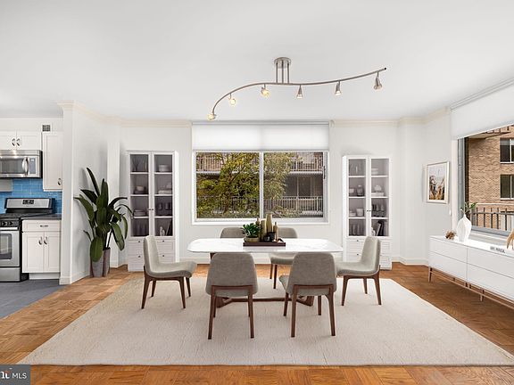 Welcome to Cathedral West Condominium, one of Washington’s distinguished “Best Addresses,” ideally situated in a quiet yet central location along Cathedral Avenue. Residence 712 offers exceptional space, classic design, and peaceful views overlooking the building’s elegant fountain and landscaped grounds. A gracious entry opens into an expansive foyer leading to a sun-filled living and dining area with hardwood floors, crown molding, and oversized windows that frame the tranquil courtyard below. The dining room, positioned with a corner of windows, provides a bright and airy setting for entertaining or everyday living. The table-space kitchen features granite counters, a glass-tile backsplash, stainless-steel appliances, and a walk-in pantry. The bedroom suite includes a walk-through dressing area with a large walk-in closet and an ensuite bath featuring dual vanities and contemporary tilework. A guest powder room and multiple closets throughout the home add convenience and generous storage. A private balcony extends the living space outdoors, offering a pleasant vantage point over Cathedral Avenue and the building’s fountain. The residence conveys with a separately deeded garage parking space and storage unit.