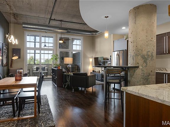 Welcome to West End Lofts! Where historic charm meets modern luxury. This beautiful loft offers an open layout with 1,119 sqft of living space, soaring 12’ ceilings, designer lighting, hardwood floors, and great natural light. The stylish kitchen features Italian cabinetry, granite counters, and newer stainless appliances, including a 2024 pro-grade gas stove. The primary suite includes a 2024 Elfa walk-in closet and luxe bath with double vanities. Also features a den/flex space, half bath, in-unit laundry, and a 17'x9' indoor/outdoor patio with gas hookup and Blackstone Grill, new HVAC and carpet 2024. Include washer, dryer, fridge, storage #69, gated parking #123. Resort amenities: pool, gym, billiards room, EV charging, Amazon Hub, dog wash, and guest suite/loft. HOA covers internet, cable, gas (incl hot water), sewer, water, trash, recycling. Nearby CWE, Forest Park, The Grove, City Foundry STL, SLU, Wash U, BJC, Cortex, Boyle Laclede Garden. This is St. Louis living at its finest!