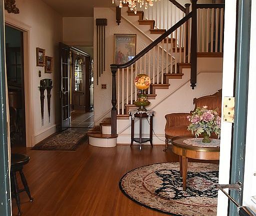 *large entrance foyer with ceramic tile entry, leaded glass sidelights & transom light, chandelier