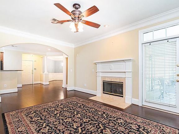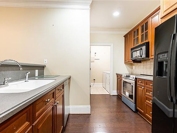 This lovely condo in a fabulous location convenient to everything features 2 bedrooms, 2 baths plus an office/den that could be a 3rd bedroom. The open concept living area features a spacious dining room, open kitchen with wood cabinetry, solid surface counters, a breakfast bar, brand new stainless electric range and an adjacent laundry room with ample storage and pantry space. All appliances remain! The elegant dining room with its detailed millworker is ready for entertaining. The spacious fireside living room has great natural light and features a French door to the covered balcony with plenty of seating space. The owner's suite has brand new carpet, a walk-on closet, access to a private small balcony and an en suite bath complete with double vanity, soaking tub and separate shower. The second bedroom also features a walk-in closet. The office/den, accessed through French doors, has a large closet and doors to the balcony. Additional tiled Bath. Hardwood floors in the main living areas and new carpet in the bedrooms and office. The unit also has 2 dedicated covered parking spots and a storage unit. This gated community is in a prime location close to Vinings Village, Silver Comet Trail, Truist Park and the Battery.