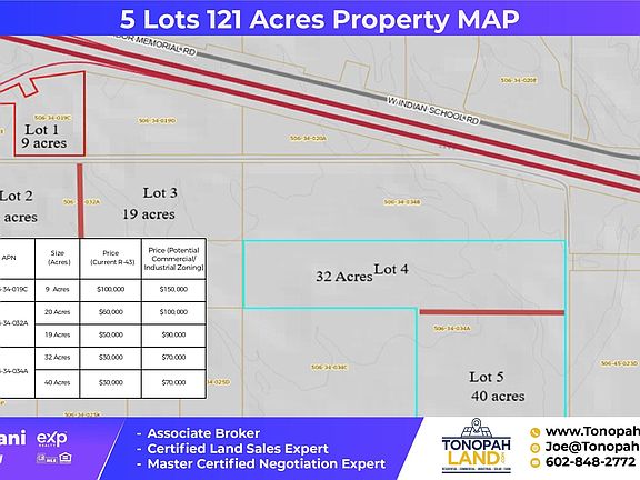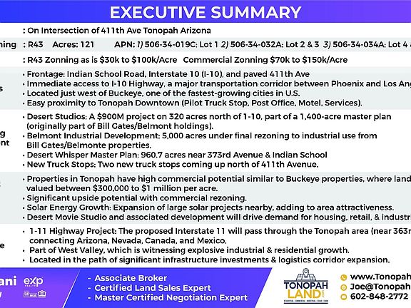 An exceptional opportunity to acquire upto 9- 121 acres strategically located at I-10 and 411th Avenue in Tonopah, Arizona. Positioned at the gateway of future growth corridors, this property offers prime commercial, office, and industrial development potential.