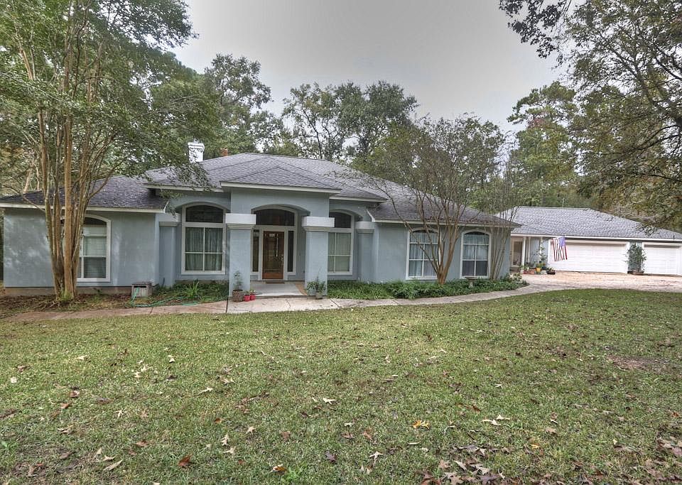 Large one-story home on almost 4 rolling, wooded acres offers amazing privacy in tranquil setting. Wood flooring, custom woodwork and built-ins,4 bedrooms, 3 full baths, large study, formal dining, generous kitchen, huge gameroom. Expansive windows bring the outdoors in. Detached 3-car garage plus guest quarters w/full bath & small fridge. (418SF quarters not included in 2933 building sf)Large deck w/outdoor kitchen & hot tub. Enjoy birds,wildlife, serenity, only minutes from Woodlands.