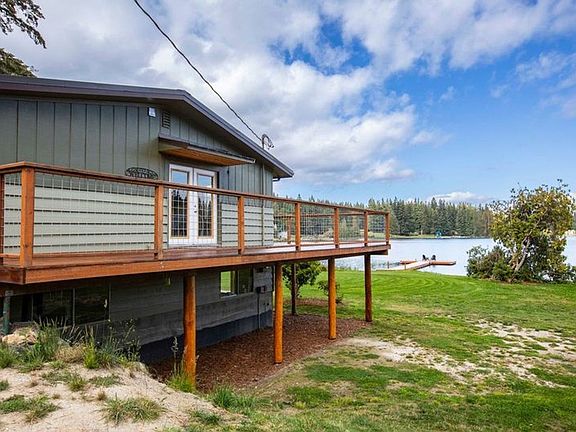 Lake front living on beautiful Deer Lake! Lovingly remodeled two bedroom and two bath home with bonus office or sleep space! Enjoy the lake view as you dine with an eat in-kitchen, dining area, large living room that leads to the expansive deck with breath taking views! Light and bright interior has newer flooring, interior paint, kitchen appliances and cabinetry and a freshly stained wrap around deck!! Bring your boat, kayaks and enjoy your own private dock and park like setting! Long drive with uncovered parking next to the house! The waterfront features a swimming area, dock and fire pit, mature fruit trees and ample garden space. Basement is retained by owner and not available to tenants. Owner maintains landscape. Available by October 1, 2024, through June 30th, 2025. This home is offered furnished, unfurnished, or partially furnished and one small dog friendly with references and additionally deposit. Sorry, smoking. Please do not access property by yourself.