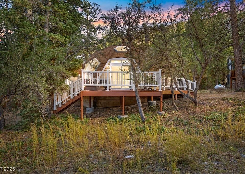 Tucked in the heart of Mt. Charleston, this light-filled home on a corner lot radiates charm and mountain character. This unique, geodesic spherical structure is known for its warm, cozy atmosphere + energy efficiency. Open floor plan includes living room, dining area and kitchen open to each other with vaulted ceiling, large pentagon & hexagon shaped skylights. Romantic wood burning fireplace in living room. One bedroom with ensuite half bathroom. Spiral staircase to upper, stand-up sleeper loft area with wrought iron handrail. Pine looking laminate flooring, granite countertops in kitchen, spacious pantry, full bathroom with tile, updated recessed lighting throughout. Laundry area plumbed and wired for washer and dryer. Large wraparound deck with composite decking and vinyl handrail. Fully functional, level topography. Four seasons, fresh alpine air, wildlife, nature - home feels a little more magical here. A sweet, uplifting sanctuary nestled in the woods awaits.