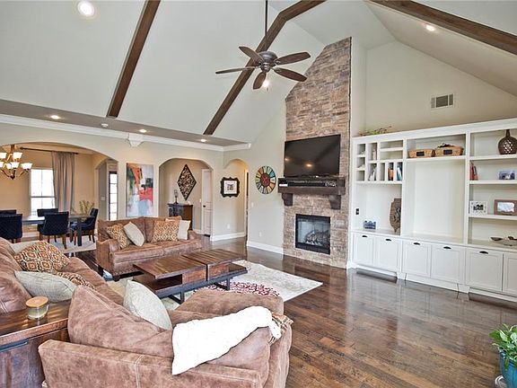 Gorgeous super upgraded home with inground saltwater pool. Open floor layout with cathedral ceilings & a floor to ceiling rock fireplace, hand scraped wood floors & a fabulous kitchen with a 5-burner gas cooktop with pot filler, walk-in pantry, granite counters, stainless appliances and custom cabinets. Central Vac, security system, storm shelter in garage floor, irrigation system, fence, blinds and so much more! Seller will provide a 1 year home warranty! You will love this home!