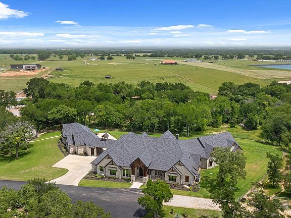 This extraordinary custom estate offers the perfect blend of luxury living and natural beauty,nestled among mature trees on over 49 pristine acres.The magnificent main residence spans more than 6800 sqft,featuring sophisticated design elements including cathedral ceilings,exposed wood beams and hand-scraped hardwood floors throughout.The main residence features a distinctive stone exterior with two elegant fireplaces creating warm and inviting spaces to gather.The kitchen is open to the living room and has a built-in fridge freezer, walk-in pantry, double ovens and spacious island.The outdoor patio is off the kitchen and has a wall of sliding doors for natural light.The primary suite is spa-like with dual vanities, soaking tub, multiple shower heads and 2 walk-in closets.The family room invites you to host guests at the wet bar with dedicated seating perfect for entertaining. Laundry features tons of storage, dog bath and space for double washer and dryer.Home also has a safe room.The estate's covered outdoor space rivals its interior amenities with an integrated speaker system, cooling fans, heaters, built-in grill, sink, fridge, bar area along with strategic landscape lighting. Over 2024sf of outdoor living. Attached by a porta cachet is a luxurious guest quarters with an attached garage.Separate 2B, 1B, cabin provides perfect accommodation for guests with privacy while maintaining proximity to the main residence.The 6 garage spaces have HVAC and around 2266sf.Property is ready for your livestock and horses with 10 separated pastures,10 loafing sheds with electric and water,10 working pens with water and shade coverage, large covered shed 60x25,equipment shed 15x20,hay shed with electric and a chicken house.There is also a 30x60 shop with HVAC, full RV hookup with water,electric,and sewer connections.The property has 2 entrances and a perfect location for your dream arena.We have a bid for a proposed arena that is 250X250 with stables.45 minutes to DFW airport.