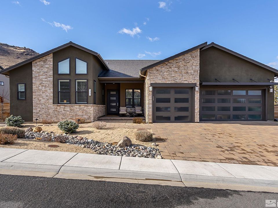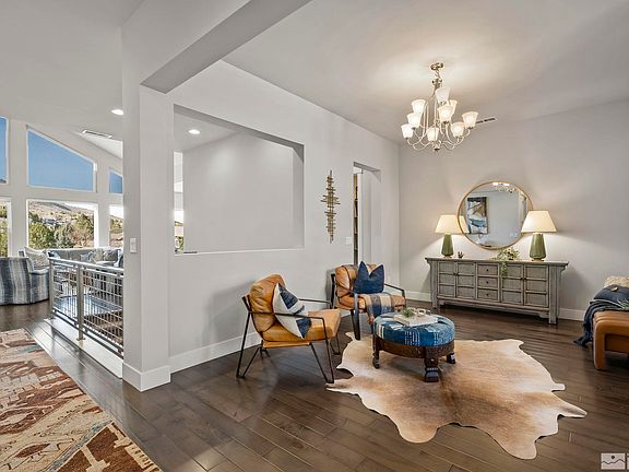Perfectly situated in the prestigious Pine Bluff community of Caughlin Ranch with remarkable views of the Sierra Mountains and Peavine Mountain creating a serene backdrop for daily living and entertaining. This home's thoughtful main level floor plan showcases an open living space with everyday dining, an expansive kitchen with butlers pantry, large formal dining area, mudroom, office nook, the primary suite, and ensuite guest room., The spacious kitchen has an oversized island, stainless appliances, induction cooktop, sub-zero fridge, walk-in pantry, and wet bar. The vaulted ceilings in the living room draw your attention to the multitude of beautiful Anderson windows allowing in plenty of sunshine and incredible views. The primary suite features a wall of windows allowing for the optimal views of the valley and mountains and has a spacious bath with walk-in shower, dual vanities, huge closet, and the first of two convenient laundry areas. Downstairs you will find a second living space with access to the covered patio, 2 bedrooms, 2 baths, a second laundry area, and a bonus flex space - perfect for a workout room, storage, or an office. Desirable details throughout the home include a small nook of the kitchen/dining area that makes for a great office, reading nook, or sitting area, a mudroom "drop zone", tons of storage and linen closets throughout the home, hardwood floors, 2 tankless hot water heaters with recirculating pump, and spacious 3 car garage. The Southwest facing home offers 2 covered outdoor entertaining areas perfect for enjoying early morning sunrises or beautiful sunsets, expansive paver patio with hot tub, and perfectly manicured lawn overlooking the Caughlin Ranch common area. The private yard backs to over 150 acres of Caughlin Ranch HOA common area.