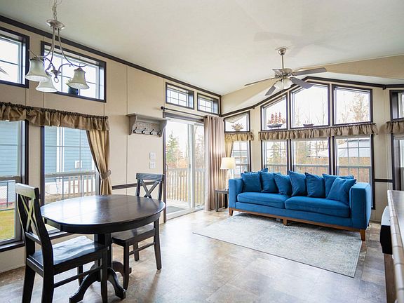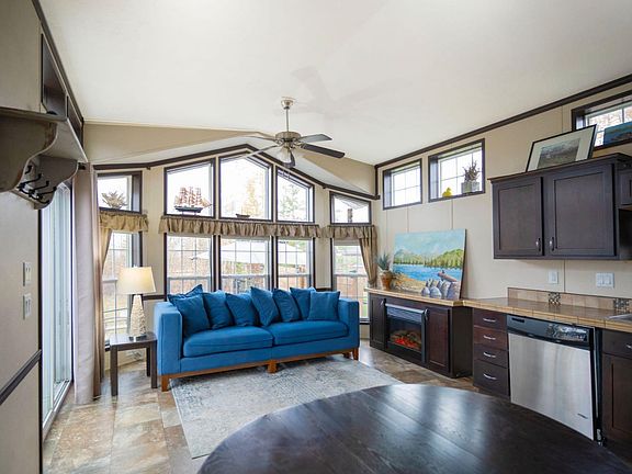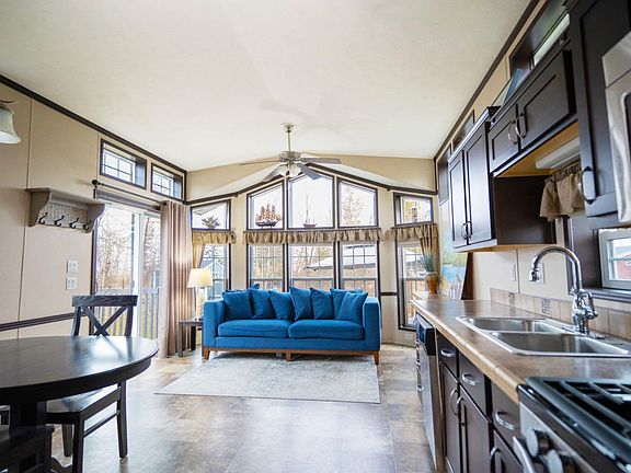 The bright open-concept interior features vaulted ceilings, upgraded finishes, and large windows that create a warm and inviting atmosphere. The kitchen is equipped with rich dark cabinetry, full-size stainless steel appliances, and generous storage, flowing easily into the living area where a built-in electric fireplace adds comfort and ambiance in every season. The added convenience of a stacked in-unit washer and dryer enhances year-round functionality. With two bedrooms, this home comfortably sleeps six. The primary bedroom includes a built-in wardrobe, while the second bedroom features double bunk beds designed to accommodate four guests. A full four-piece bathroom completes the interior with residential-style comfort.