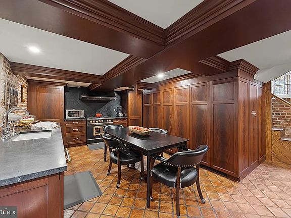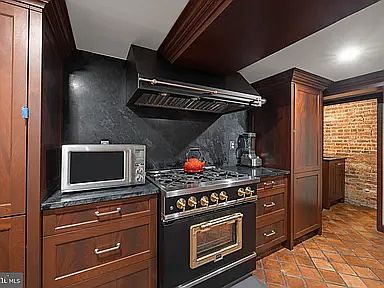Private in-unit laundryModern washer and dryerExposed brick wallWarm terracotta tile floorsDark wood panelingDark soapstone countertopsGourmet eat-in kitchen