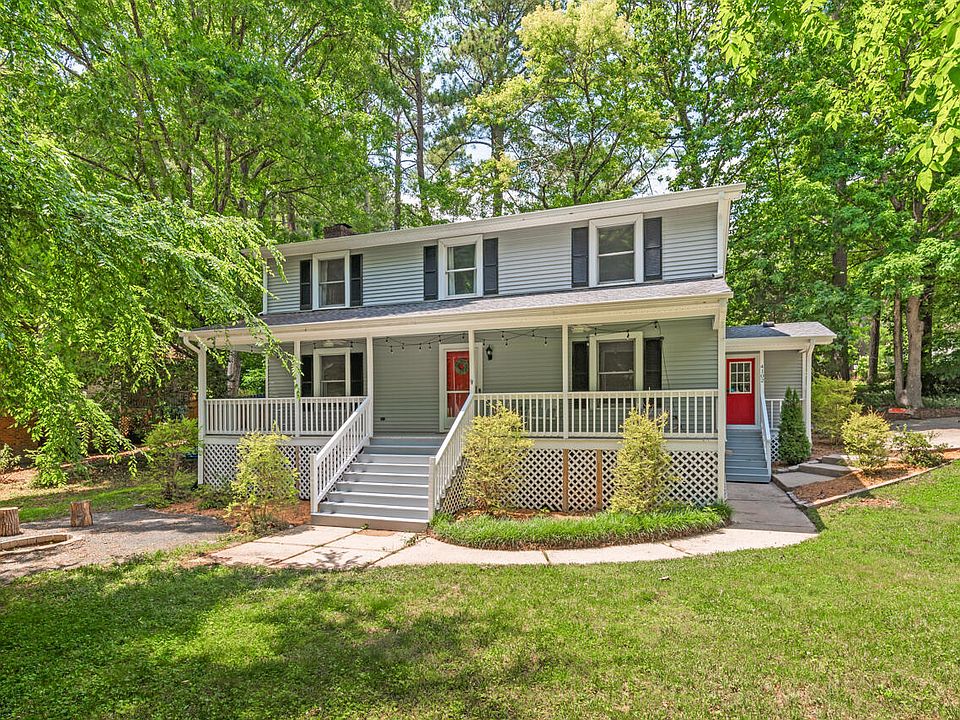 Exhale as you are transported you to a bygone era in idyllic Trotter Ridge. The 39-ft quintessential rocking chair front porch beckons you inside to an open, light-filled floor plan. Updates include a newer heat pump (2022), roof (2019) and smooth ceilings. Custom cabinets and a wood-burning fireplace adorn the spacious living room that opens to a large deck overlooking the private, fenced yard. The spacious corner is vibrant with birds and wildlife and would easily accommodate the garden of your dreams! Relax by the fire pit as the symphony of cicadas recedes. Super close to Jordan High School and Garrett Rd Park and easy access to Third Fork Creek Trail and the entire ATT. Experience for yourself what sets this neighborhood apart!