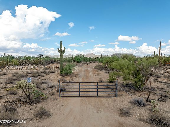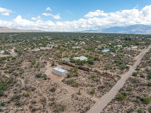 Nice 4.38 acres parcel with immediate usability of the 1500 sq ft solid block built RV garage with septic, water and electric run to it. Building has a garage area and rooms framed & drywalled, mostly finished which can be used for storage or other use. Half bath framed in. Termite treatment done and in warranty. Some flood plain runs through the property, yet nice flat building area for easy construction does exist. Gorgeous natural desert landscape with a walking path that meanders through and around the property. Full fence in place with gate at front.