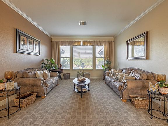 Absolutely stunning single story Harris home!  This home offers 4 bedrooms and 3 bathrooms. As soon as you enter the foyer you will see the most inviting conversation room with custom carpet and crown molding throughout.  The kitchen boasts custom countertops, ample storage, stainless steel appliances and additional bar seating overlooking the spacious family room with a fireplace nestled in the corner.  The grand primary bedroom has double door entry, ceiling fan, beautiful double doors to backyard oasis, and a huge en suite with soaker garden tub, double sinks, and an incredibly spacious walk in closet. There are also 3 other large bedrooms and 2 more full baths.  The backyard oasis has multiple covered patios, a calming pond, spa, garden, custom concrete design, large grass area, 2 large sheds, 3 car garage, and HUGE RV access for multiple RV's and cars!!  This IS your new home!!
