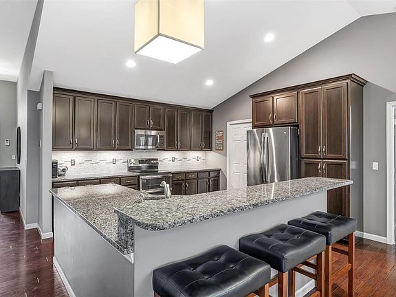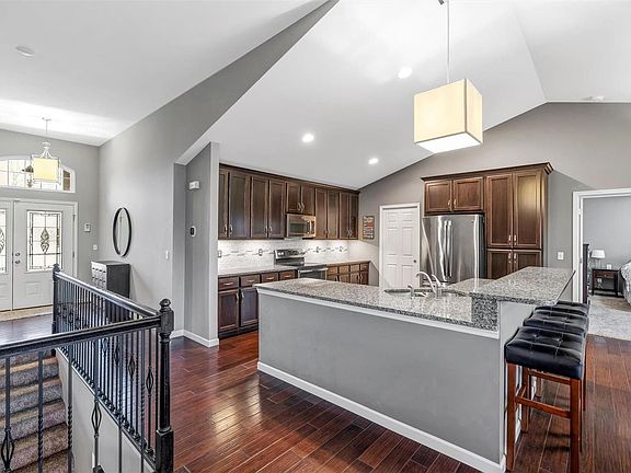 Welcome to this stunning 3-bedroom, 3-bathroom ranch home that perfectly combines luxury and comfort. Upon entry, you're immediately greeted by soaring 10+ foot ceilings, enhancing the open and airy feel. The vaulted ceilings in the living spaces create a dramatic sense of grandeur, while custom-built shelving adds an elegant, personal touch to the home’s design. The living room boasts a gorgeous gas fireplace with a marble surround. The heart of the home is the chef-inspired kitchen, featuring custom shaker-style maple cabinets with soft-close doors and drawers. Retreat to the primary suite, that includes a spa-like bathroom with double-dowel adult-high vanity, separate tub and shower, and walk-in closet. The finished walkout basement is an entertainer's dream, complete with a custom wet bar and a convenient 1/2 bath. A rare find, this home also features a 23.5' deep oversized 3-car garage, providing plenty of space for all your storage needs and vehicles. Don’t miss the opportunity!