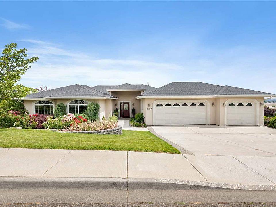 Relax and enjoy the view from this 2472 sq ft stucco rambler in West Pasco. Well maintained 4 bedroom home with 2.5 baths. You have a formal living room with gas fireplace, built- ins, and a slider to the covered patio with a lovely view. The kitchen and family room are combined, with the dining area with a french door to the open patio. The kitchen has granite counter tops, stainless appliances, island with a breakfast bar, and cherry cabinets. Split bedroom design. Spacious master suite with patio access. The master bath has a corner jetted tub, separate shower, dual vanity, and walk in closet. Secondary bedrooms are nice sized near the full bath with dual sinks. Large tile entry/foyer, raised and coffered ceilings Laundry has cabinets, and sink. Large 3 car finished garage with side door to backyard. Extensive shelving and storage!! Gardner's dream, roses galore, terraced on side and backyard. Great corner lot with an awesome view. Easy to show