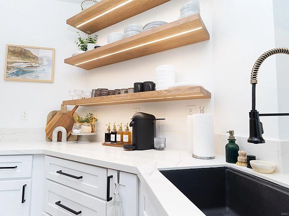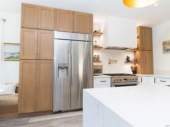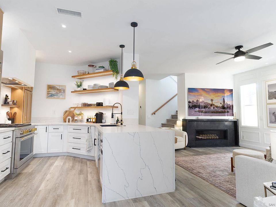 Immaculate Bonita Creek home! Highly upgraded living space with custom kitchen featuring white oak, white shaker cabinets, and solid white oak floating shelves, full stone backsplash with dramatic island waterfall, built-in brass water spout, stone farmhouse sink, stainless steel built-in-refrigerator, 36" 6 burner GE Monogram range, premium light fixtures throughout, custom wood trim in living room with gallery lighting, custom Venetian plaster fireplace surround with remote start lighter, luxury vinyl plank flooring, new Sherwin-Williams paint throughout, remodeled bathrooms boast designer tile-in showers and tubs, newer water heater and AC. Attached garage with electric vehicle charger. Private house with no backyard or side neighbor and yard with green space views, gated community with pool/spa!
