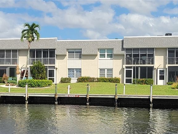 TURNKEY FURNISHED SAILBOAT ACCESS CONDO WITH STUNNING SUNSET VIEWS! This 2nd Floor unit is located just off of Beach Parkway. Tastefully & recently updated with NO BRIDGES Gulf Access and just minutes to the river. Experience the ultimate waterfront lifestyle-watch the dolphins play from the boat dockage right in your backyard! This fully furnished condo offers the perfect blend of comfort, convenience, & stunning views. Meticulously maintained and recently updated unit with new flooring throughout, fresh paint, crown molding- the open-concept living space is bathed in natural light, creating an airy and spacious feel. Living room, with sliders that showcase picturesque views of the water and vibrant sunsets. The updated kitchen features newer appliances, abundant cabinetry, and a well-appointed layout. It comes complete with all dishes, glassware, pots & pans, cookware and small appliances....a huge savings when outfitting a new kitchen! Recently re-plumbed, NEW A/C installed November, 2024, newer water heater, IMPACT WINDOWS throughout and electric shutters at the lanai, ensuring convenience, security, and protection against inclement weather. The primary bedroom offers water views & private bath. The community room has been updated & is complete with fully equipped kitchen, restrooms & workshop. Enjoy the best of both worlds...Walking distance to Jaycee Park which is undergoing an $18 million dollar enhancement with opening scheduled early 2026 and will include a bandshell, a bistro and a boardwalk along the river. Enjoy a quick morning walk or bike ride to experience a breathtaking sunrise on the river and complete your day relaxing on your Lanai or relax poolside to gather with friends and enjoy the stunningly beautiful sunsets. Located conveniently near shopping & dining with quick access to Fort Myers and the Beaches. Truly, the coastal lifestyle, with an abundance of Cape Corals best dining, shopping options and with beaches just a short drive away.