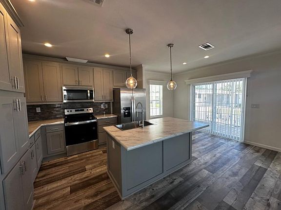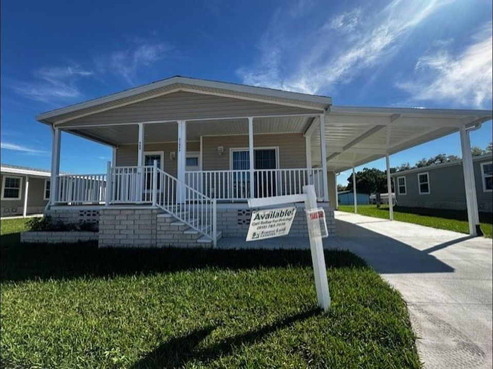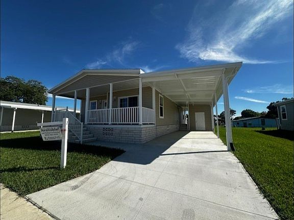55+ age qualified community. The Santa Rosa model is unique as it is the only home that has a large front porch that is the entire width of the home. This beautiful porch is a great place to relax and enjoy the wonderful breezes while chatting with neighbors as they walk by. This community is designed for an active lifestyle as it has a huge amenity package that is no additional cost to our residents, and the entire community has sidewalks creating an environment for comfortable walking for yourself and pets. You enter the home into a beautiful open plan with a large island that accommodates 4 stools. Directly off the kitchen is the dining room that has sliding doors that lead out to the large front porch. This is a 3 bedroom 2 bath home with the primary having an ensuite large bathroom with a high end walk in shower. This primary bathroom is larger than most and has a huge linen closet in addition to the walk in closet in the main bedroom. Having storage will not be a problem in this home. Looking to entertain, this home is designed for it. A full 5 piece stainless steel kitchen package is included, the designer gooseneck faucet and large stainless farmhouse sink are show stoppers, and the solid floors throughout the home make for easy maintenance.The home has a shed directly off the carport and the home sits on an oversized lot and is available for immediate showing. Looking for an active 55+ community Forest Lake Estates is the place for you. Call for a private tour.