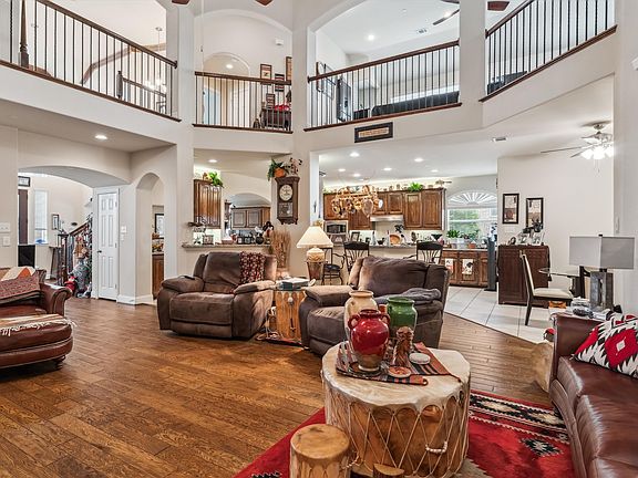 The formal dining room provides an elegant setting for entertaining, while the kitchen boasts built-in cabinets, expansive counter space, and a breakfast nook—perfect for casual meals. The kitchen overlooks the spacious living room with a gas fireplace. Situated just off of the living room, the primary suite features a spa-like master bathroom with dual sinks, a separate shower, and a soaking tub. Also downstairs is a second bedroom with a nearby hall bathroom. Step outside to the covered back patio, equipped with gas hookups for outdoor cooking, perfect for hosting gatherings. Jellyfish lighting beautifully illuminates the exterior, while French drains in the backyard ensure proper drainage. The lush St. Augustine grass, mature trees, and professional landscaping enhance the curb appeal. Upstairs, enjoy a spacious game room, a dedicated office or media room, three additional bedrooms, and a Jack-and-Jill bathroom. Located close to highways 635, 30, and 190, this home offers easy access to major routes. Plus, Lake Ray Hubbard is just a short drive away, providing stunning scenery and recreational opportunities. Public record has the total building Sq Ft is 5,091.