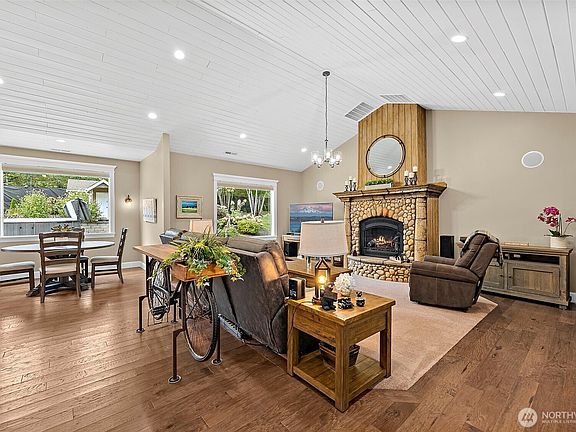 Stone fireplaceOpen floor planGarden spacePeaceful settingFormal diningOutdoor tvOversized island