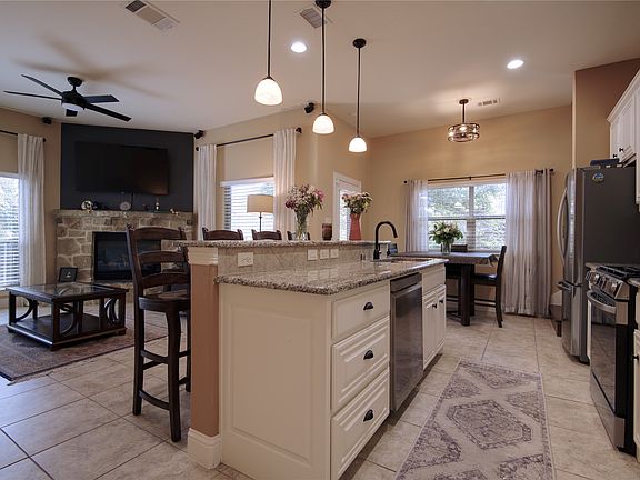 The inviting living room showcases a stunning stone fireplace with an oversized flat-screen TV mounted above the mantle that conveys with the sale. The spacious primary suite on the first floor offers a spa-like bath with a garden tub, separate shower, and dual vanities. A versatile secondary bedroom and full bath with a cozy nook are also located downstairs. Upstairs, a third bedroom includes a full bath plus an additional nook that can flex as a small office or game room.
