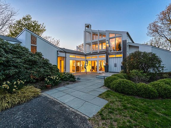 Perched on a 100-foot-high bluff with commanding views of Long Island Sound, this exceptional 3 + bedroom, 5 bath contemporary home is a rare fusion of design, privacy, and natural beauty. Originally designed and built in 1986 by architect Sanford Hanuer for his own use, the 3,348 sq ft residence was completely reimagined in 2011, preserving its architectural integrity while introducing luxurious modern updates. Set on 2.45 acres with 190 feet of private beachfront, the home is sited at an angle to capture uninterrupted water views from every room. Floor-to-ceiling windows, bluestone and wide ash plank flooring, and three fireplaces create a warm yet sophisticated interior. The Eggersmann-designed kitchen with butler's pantry is a chef's dream, and the home's layout includes a loft and multiple decks and patios ideal for seamless indoor-outdoor living. The white-stained cedar exterior blends harmoniously with the surroundings. Below the home, a 50-foot pool with lanai and expansive deck is tucked 10 feet down the bluff, preserving both privacy and unobstructed views. Two + bedrooms are sectioned off to serve as a separate guest cottage. Every inch of this property has been thoughtfully designed to elevate the art of waterfront living - from floor to ceiling windows, white Italian marble bathrooms to golden-hour dinners on the patio overlooking the Sound. This is not to be missed!