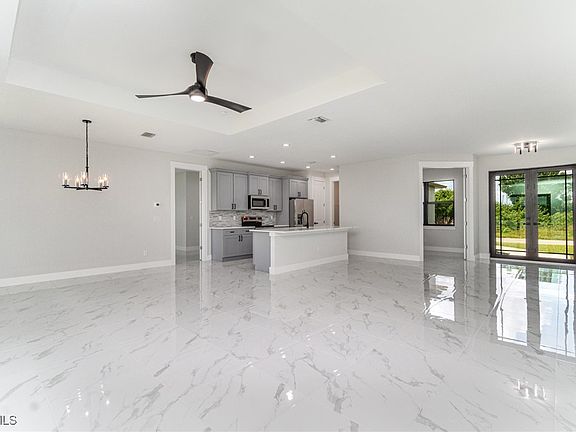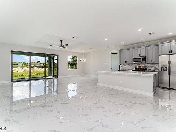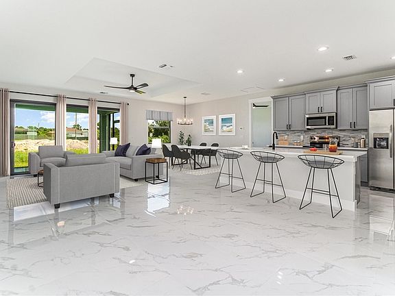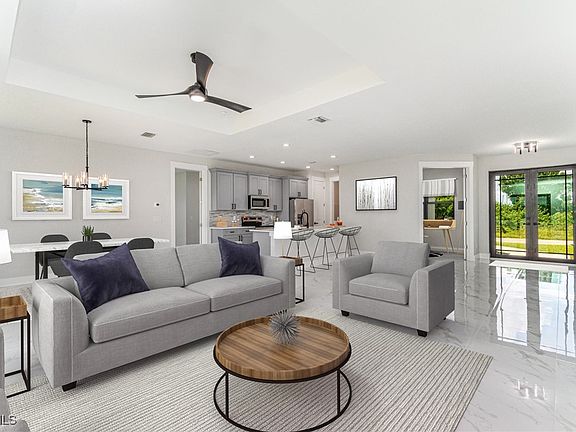 Welcome to your dream home, a brand-new construction in a prime central location in Lehigh Acres. This home offers a perfect mix of luxury, style, and convenience, built with exceptional quality and attention to detail. It's designed for modern living and peace of mind. This spacious 3-bedroom, 2-bathroom residence features a versatile den that's perfect for a home office or cozy reading nook. The split floor plan ensures privacy, with the luxurious primary suite tucked away on one side of the home. The primary suite is a true retreat, boasting an elegant tray ceiling and two spacious walk-in closets. In the spa-like primary bathroom, you can relax in a standalone soaking tub or enjoy the sleek, frameless shower. The bathroom also features two separate sinks and vanities, along with a private water closet. The heart of the home is the chef's kitchen, which features high-end GE brand stainless steel appliances, elegant quartz countertops, and soft-close cabinetry with a beautiful tiled backsplash. This space flows seamlessly into the large great room, making it ideal for entertaining. Throughout the home, you'll find 8-foot doors, decorative lighting and fans, and stunning large tile flooring. The living room also has a tray ceiling, adding an extra touch of sophistication. Beyond the stunning interior, you'll find top-of-the-line features for comfort and security. Hurricane impact windows and doors provide superior protection and energy efficiency. The exterior features a beautifully landscaped yard with lawn irrigation, which you can view from the screened-in lanai. The builder even added an integrated pest control system, allowing for easy access and a pest-free home. This fantastic location puts you close to everything you need. You're just a short drive from RSW International Airport, SR-82, and I-75, making travel a breeze. Enjoy the excitement of Spring Training for the Boston Red Sox and Minnesota Twins, or explore the area's excellent shopping and dining. When you're ready for a day in the sun, the beautiful Gulf Coast beaches are not far away. This home is more than just a place to live—it's a lifestyle. Come see what makes this brand-new home so special.