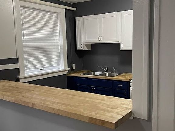 You'll love the kitchen's modern flair, featuring deep blue lower cabinets with sleek hardware, crisp white uppers, and butcher block countertops that add warmth and functionality. A pass-through bar counter opens up the space and invites easy entertaining or casual dining. Pull up a bar stool and enjoy your next meal! The vintage-style bathroom includes a classic clawfoot tub, black-and-white hex tile flooring, and white subway tile wallsbringing timeless style to your daily routine.