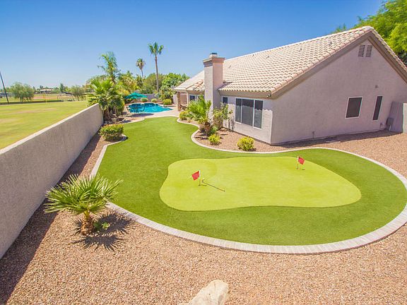 Ahwatukee GEM! One owner 3 bed, 2 bath single level home in beautiful Mountain Park Ranch. Interior features incl neutral 18in tile through out the home, 2 tone designer palate paint colors, Corian counters with large molded sink, & breakfast bar open into an oversized family room, SS appliances, remodeled baths w/ full tile showers, and a custom master closet. Fireplace in LR, formal dining, w/ custom built in cabinets/wine storage. Oversized culdesac lot features shade trees & tasteful landscaping in front, a HUGE sparkling diving pool with spa! The RESORT style backyard features a covered patio, & a large artificial turf yard with putting green!! Covered gazebo with built in seating and gas fire pit to complete this ENTERTAINERS DREAM home! Wide paved side gate entry - Bring your toys!!