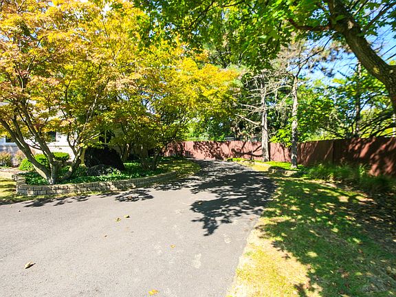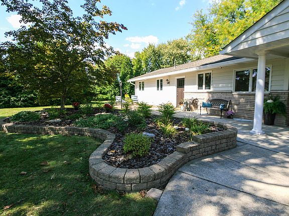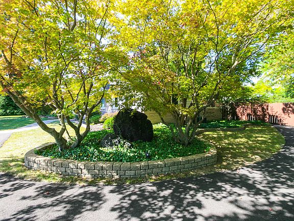 Additional highlights include two wood-burning fireplaces, three bedrooms, three full bathrooms, and a 25' x 42' 3 1/2 car detached garage with heat, connected to the home by a spacious covered patio. Three sheds provide extra storage space. The large, fully fenced, private wooded backyard and spacious covered patio are ideal for relaxing and entertaining.