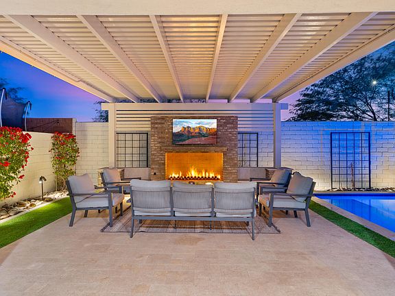 Step into this beautiful home, where you're immediately greeted by a spacious foyer with elegant wood-like plank tiling and crisp white and modern smooth finished walls featuring sleek 90° squared corners. To your left, you'll find a cozy guest bedroom and a full bathroom with a modern shower, perfect for visitors or multi-generational living. Just beyond, double doors open to a stylish den, ideal for a home office or quiet retreat. As you continue further into the heart of the home, you'll fall in love with the open-concept living space, where the kitchen, dining, and living areas flow seamlessly together. The living room is a showstopper, featuring gorgeous board and batten accents, abundant natural light, and built-in surround sound speakers that make it perfect for relaxing or entertaining. The kitchen is a true masterpiece, with stunning quartz countertops, pristine white Café appliances, a sleek black granite composite sink, and double ovens. Two additional kitchen areaseach with generous counter space and cabinetryadd to the convenience and elegance of this home. As you move down the hall, you'll find two spacious secondary bedrooms and a full bathroom, complete with a vanity and ample storage. The adjacent laundry room offers built-in cabinetry for added organization and functionality. The primary suite is a sanctuary of light and space, featuring plantation shutters and a charming barn door that leads into the luxurious primary bathroom. Here, you'll find an impressive super shower, fully tiled from floor to ceiling, with a beautiful bench and quartz countertops offering both style and practicality. Plenty of drawers ensure you'll have all the storage you need. The backyard is an entertainer's dream. A built-in barbecue and sink make outdoor cooking a breeze, while the misters provide comfort on warm days. The large pergola extends over a stunning built-in fireplace, complete with a TV and a wrought-iron trellis, leading to the sparkling HEATED Pebble Tec pool. The pool features a waterfall, Baja shelf, and exquisite outdoor lighting to create the perfect ambiance for evenings by the water. Plus, with no neighbors behind you, the backyard offers unparalleled privacy. This home has it allelegance, comfort, and the ideal setting for entertaining or relaxing in your own private oasis. Don't miss out on the opportunity to make it yours!