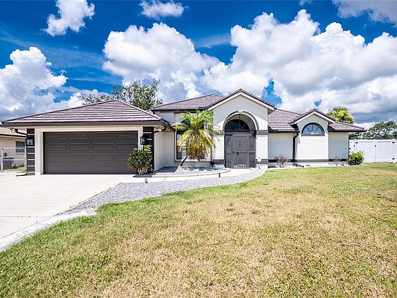 Impressive WATERFRONT home offers boating access to Charlotte Harbor and the Gulf of Mexico. Less than 10 minutes and only one bridge. 95 foot concrete seawall, concrete dock, davits and 4000 lb boat lift. This light and bright home has beautiful design features throughout. It is located in a cul-de-sac and offers an open and split bedroom floor plan, 3 Bedrooms, 2 Bathrooms, 2 Car Garage, Living Room, Dining Room, Family Room, well appointed Kitchen, Inside Laundry and screened Lanai. The Dining Room has a large window with arched window above it. The Living Room offers a cathedral ceiling, plant shelves and sliding glass door to the lanai. The Kitchen features wood cabinets, granite counters, tile backsplash, breakfast bar and stainless appliances. Appliances include side by side refrigerator, dishwasher, oven /range with gas burners (propane fuel)- stove is both electric and gas- and range hood. There is an area off the kitchen that can be accessed by sliding glass doors. It has cabinets and under counter refrigerator perfect fo your guests. The Kitchen opens to the Family Room with tile flooring, cathedral ceiling and plant shelves. There is an Inside Laundry Room with washer, dryer and cabinets. The Master Bedroom suite features Lanai access, vaulted ceiling and private bathroom with dual sinks, garden tub, arched window and walk in shower. There are two generous sized guest bedrooms with double closets and the guest bathroom has a walk in shower. Your living space extends to the large screened lanai with spacious covered area, inground pool and plenty of deck for sunbathing. Your living space extends to the waterfront as the backyard also has a pergola, a deck at the waterfront, storage shed for your boating equipment and large paver patio which also 0ffers open storage. New Steel roof-weather proof, wind, storm, fire proof, 50 year warranty - 2024, Updated pool deck - 2025, LED pool light, Hurricane proof garage door - 2023, Hurricane shutters, New updated master and guest bathroomsNew AC - 2024, New pool heater - 2024, New gutters - 2024, New Fence - 2024, New sidewalk - 2024, New patio/area to store boat - 2025- approx 850 sq ft, New flooring in all bedrooms. Most of the ceiling fans and light fixtures have been replaced. Laundry room has been updated and seller put in a snack bar. Irrigation system has been updated. Other features include screened front entry, double door entry with transom window, rain gutters, hurricane shutters. NO HOA. This home is minutes from shopping, dining, medical care, waterfront parks.