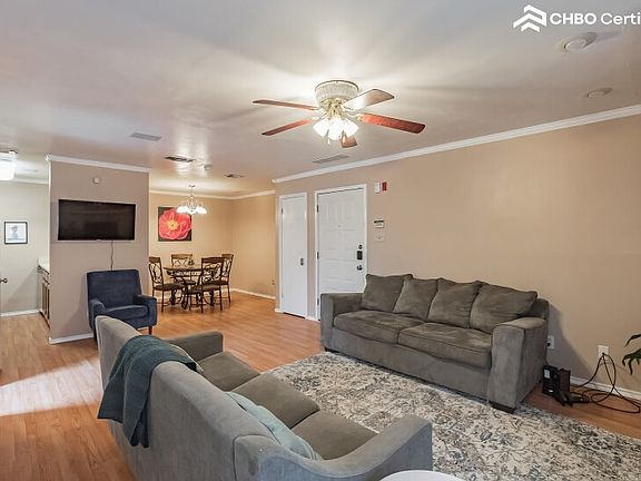 The living room, dining room, and kitchen are all in an open space, so you can entertain and socialize with people in separate rooms. The living room is set up with comfortable seating options, a ceiling fan, and a television so you can catch up on your favorite shows.
