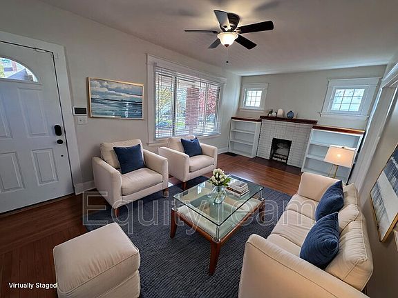 Detached garageFresh paintDecorative fireplaceHardwood floorings