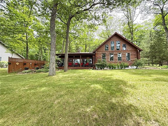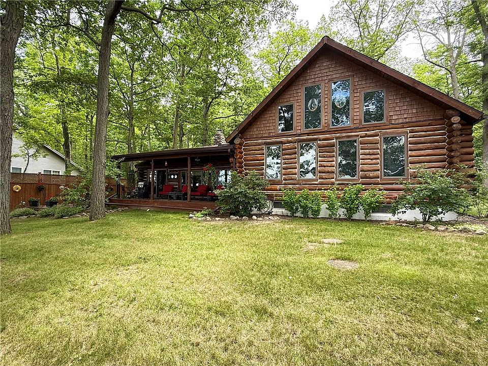 Welcome to your Dream Lakefront retreat—this stunning log cabin home offers 100 feet of prime lake frontage, spread across two parcels for a rare and versatile opportunity. The main home boasts 90 feet of frontage and features an open floor plan with a large formal living room adorned with cathedral ceilings, exposed wood beams, and sweeping lake views. A spacious family room is anchored by a floor-to-ceiling stone fireplace, while the formal dining area with glass sliding doors leads to a generous deck and deep backyard that takes you right to the water’s edge via metal steps. The kitchen includes bar seating and flows seamlessly into the living areas, all enhanced by rich hardwood floors throughout. The home has been thoughtfully renovated, with the south side addition built in approximately 1993, blending beautifully with the original charm. The first floor offers two bedrooms and a full bath, while the second floor includes an additional bedroom and full bath, also featuring cathedral ceilings and lake-facing windows.