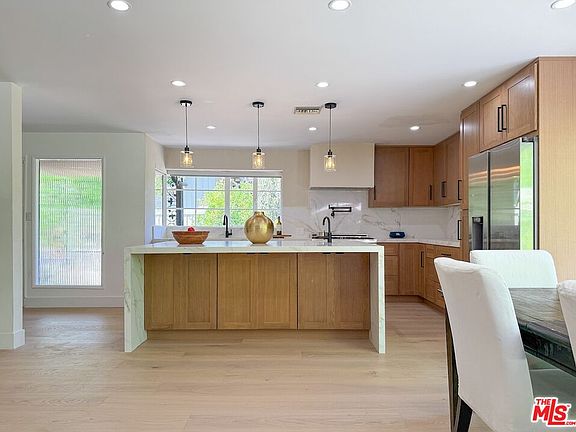 Tucked at the end of a quiet cul-de-sac in prime Sherman Oaks, this single-story 3BR/2.5BA (~2,109 sf) blends style, privacy, and effortless indoor-outdoor living. A clean modern palette wide-plank oak floors, recessed lighting, Roman Clay walls frames a chef's kitchen with a 7'x5' waterfall island, prep sink, pot filler, and 36" Thermador range. The sun-drenched primary suite opens to a lush yard with a 40' heated lap pool (10' deep), sun decks, grassy play area, and golden-hour valley views. A third bedroom with en-suite bath is perfect for guests or a luxe home office. Extras: brand-new 15-panel solar (lower utilities), outdoor loungers + heaters, and unbeatable proximity to Ventura Blvd favorites, Equinox, and Fashion Square Mall. Available fully furnished and turnkey. Flexible lease terms (short, mid, or long). This is elevated Sherman Oaks living private, polished, and ready now.