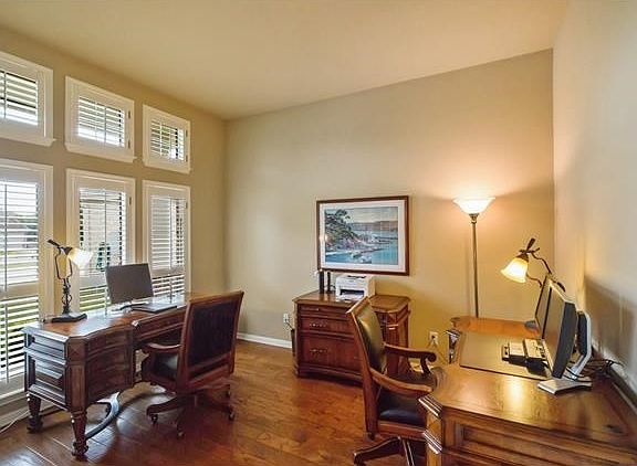 Immaculate, well-loved single story, beautiful upgrades on cul-de-sac! Welcoming brick front porch, open floorplan& tall ceilings. Gorgeous hand-scraped wood flooring & tile. Elegant entry, dining, office w Fr doors. Channel your inner chef in this kitchen w granite counter, island, SS, gorgeous raw walnut cabinets, tons of counter. RO water filter system.Wired for surround in GR, owner's & patio. 3-CAR GARAGE!!Covered patio for the grill/Lush landscaping& walkway to pergola(your morning coffee hideaway).