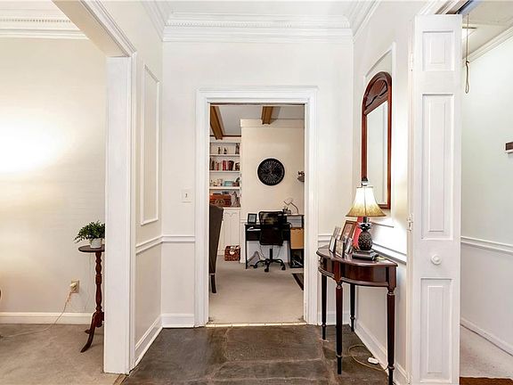 Cozy brick fireplaceWood-beamed ceilingsFlat backyardBreakfast areaBuilt-in cabinetsWhite cabinetsStunning azaleas in bloom