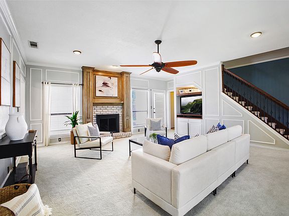 Cozy gas log fireplaceFormal dining roomStainless steel appliancesCovered patioLarge kitchenSunny breakfast nookArched brick front porch