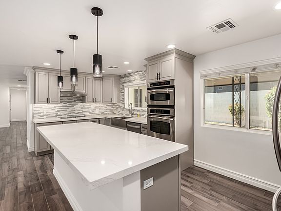 The designer kitchen is a showstopper, boasting an oversized 9' x 4' center island, sleek grey maple cabinetry, and premium white quartz countertops. A cozy breakfast nook completes the space, offering style and functionality in every detail. Homes like this rarely come available, come see it today and prepare to be impressed! Home has been freshly painted and new carpet installed.