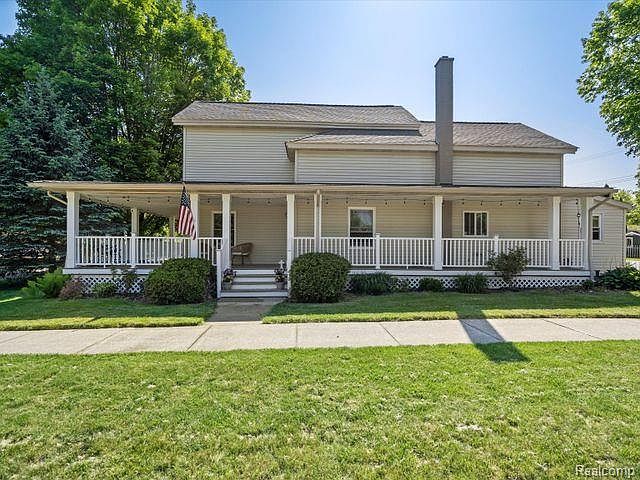 Enjoy all that Metamora has to offer in this beautiful home that sits only walking distance from the historic White Horse Inn and the General Store! Spend summer nights enjoying Metamora's Music in the Park right from your spacious wrap-around porch! This home features a spacious kitchen with new appliances, paint, quartz countertops and more and Hickory wood flooring throughout the living room. Lots of natural light throughout the home! Main-floor primary bedroom. Spacious main-floor laundry and mudroom with storage galore! New carpet and paint throughout the entire second floor. Additional updated three-season room / bonus space off of the garage - perfect for mancave, entertaining, and more! Newer resealed asphalt driveway. Updates include: Painted throughout home (2023), carpet throughout (2023), Wood flooring (2022), kitchen appliance, countertops, etc. (2023), Sump Pump (2023) and much more. Situated on almost a half acre with mature maple trees, gardens, and young fruit trees. Come enjoy country living in the Village of Metamora!
