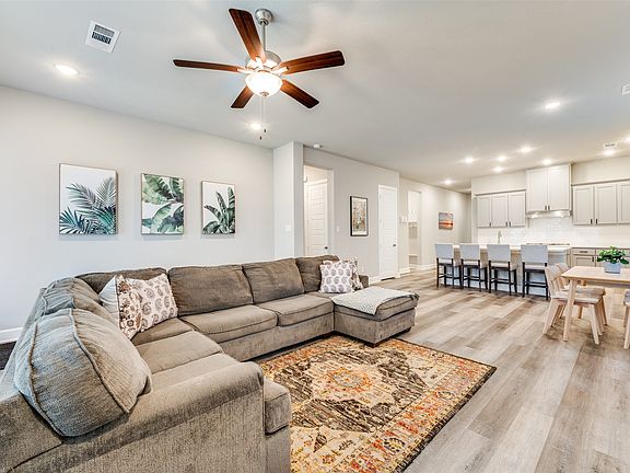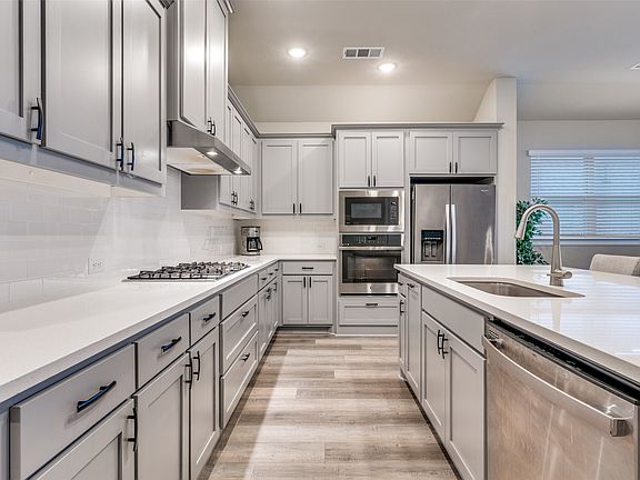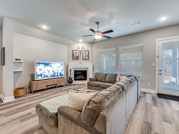 Come tour this contemporary one-story home built by David Weekley in 2021 located on a quiet cul de sac street with little through traffic. Offered at an incredible value with upgrades already included, why pay nearly 15% more to build this Belton floorplan today? Sandbrock Ranch is located in the city of Aubrey and offers the best of both worlds—small-town living just minutes from big-city conveniences. This popular master planned community boasts an on site elementary school and premium amenities like beach entry pool, splash pad, state of the art club house with fitness center, fishing lakes, playground, dog parks, and community events. Notable features throughout this home include luxury vinyl plank floors in main areas, upgraded wall tile, 8 foot 6 panel doors, led lighting and a tankless water heater. The modern kitchen has soft grey cabinets, quartz counters, an oversized island with room for 4 stools, subway tile back splash, a GE 5 burner gas cooktop, wall oven and microwave, as well as built in trash bin. A versatile dining nook offers flexibility for a large dining table or none at all. Adjacent is the cozy living area with gas fireplace encased in a stylish white wood frame. The split floorplan provides privacy and functionality, with 2 bedrooms and a shared hall bath off the entry, while the primary suite is tucked away overlooking the backyard. The primary bath has a spacious footprint and includes a dual sink vanity with optimal storage drawers, separate shower with river rock base, soaking tub, and a walk in closet with custom shelving. Outside in the backyard there is plenty of room to relax and entertain on the extended covered patio.