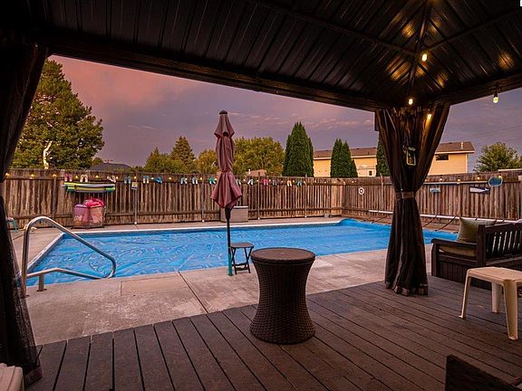 Wood burning fireplaceRoom for a shopFormal dining spaceInground poolExpansive deck and patioWalk in showerFenced in pool area