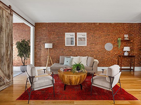 411 15th Street, Unit M :: This cheerfully renovated Park Slope 2 bedroom apartment is located one block from Prospect Park in a beautifully maintained coop building. Set on the third floor, enter into a foyer that leads into a large living and dining room adorned with an exposed brick wall and a unique rustic-design custom barn door. The living / dining room seamlessly flows to a windowed open kitchen with full-size modern appliances, including a double door refrigerator, a washer / dryer unit and dishwasher, as well as quartz countertops and a lovely farmhouse sink. There is bountiful cabinet storage and counter space, all set around a central island with ample room for stool seating. The queen-size bedrooms are comfortable, cozy and quiet, and one boasts a custom floor-to-ceiling closet. The bedroom windows overlook a lovely common garden in the back, complete with table and chairs and chaise lounges for warmer months. The windowed bathroom is outfitted in crisp white marble tiles, with a walk-in shower featuring fixtures by Grohe and Toto. With spotless, perfect flooring, this apartment truly shines.