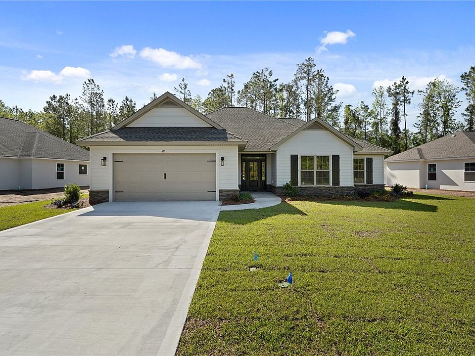 This is a beautiful 4 bedroom, 2 1/2 bathroom cement lap siding home has a double garage with opener, 2 remotes and stone foundation finish at front and gutters at front porch. This house has 30 year architectural shingles. The foyer and great room have 10' ceilings with 9' ceilings throughout the rest of the house. This home is complete with custom recessed panel painted cabinets in bathrooms, kitchen, and laundry room. There are beautiful solid surface countertops in the kitchen and bathrooms. The main bathroom is complete with a garden tub and separate tile shower with a glass enclosure. The kitchen, dining room, foyer, great room and main bedroom are finished with 4 5/8" crown molding. Ceiling fans are included in the great room, bedrooms, and on the back porch. Carriage lamps and carriage style garage door trim included! There is front porch, rear porch with ceiling fan, and a concrete grilling pad. This home includes a community irrigation water system. The cost of water for irrigation is $27.50 for up to 10,000 gallons per month with an additional charge for each additional 1,000 gallons.